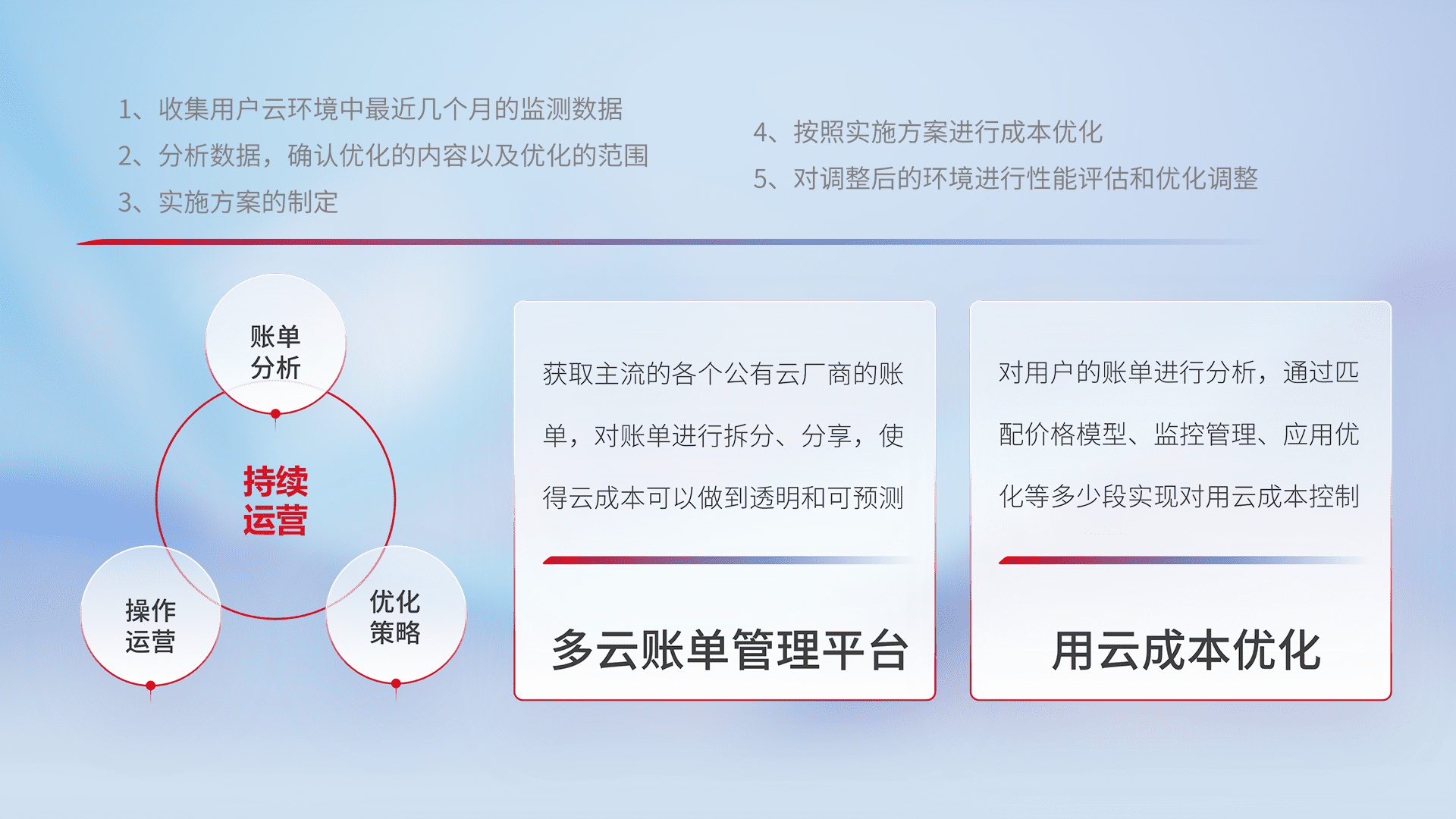 通过多云纳管,,以统一的资源数据模型把客户的云资源进行抽象和封装,,进而实现对多云资源的统一操作,,,,保障云资源管理的可靠性、、、稳定性与可用性。。量身定制化运维内容,,配置、、开发运维、、补丁管理、、、、备份、、、监控、、、、认证和访问管理、、、、审计和日常巡检等,,,保障在用云过程中的可靠度,,,,稳定度以及高可用率。。